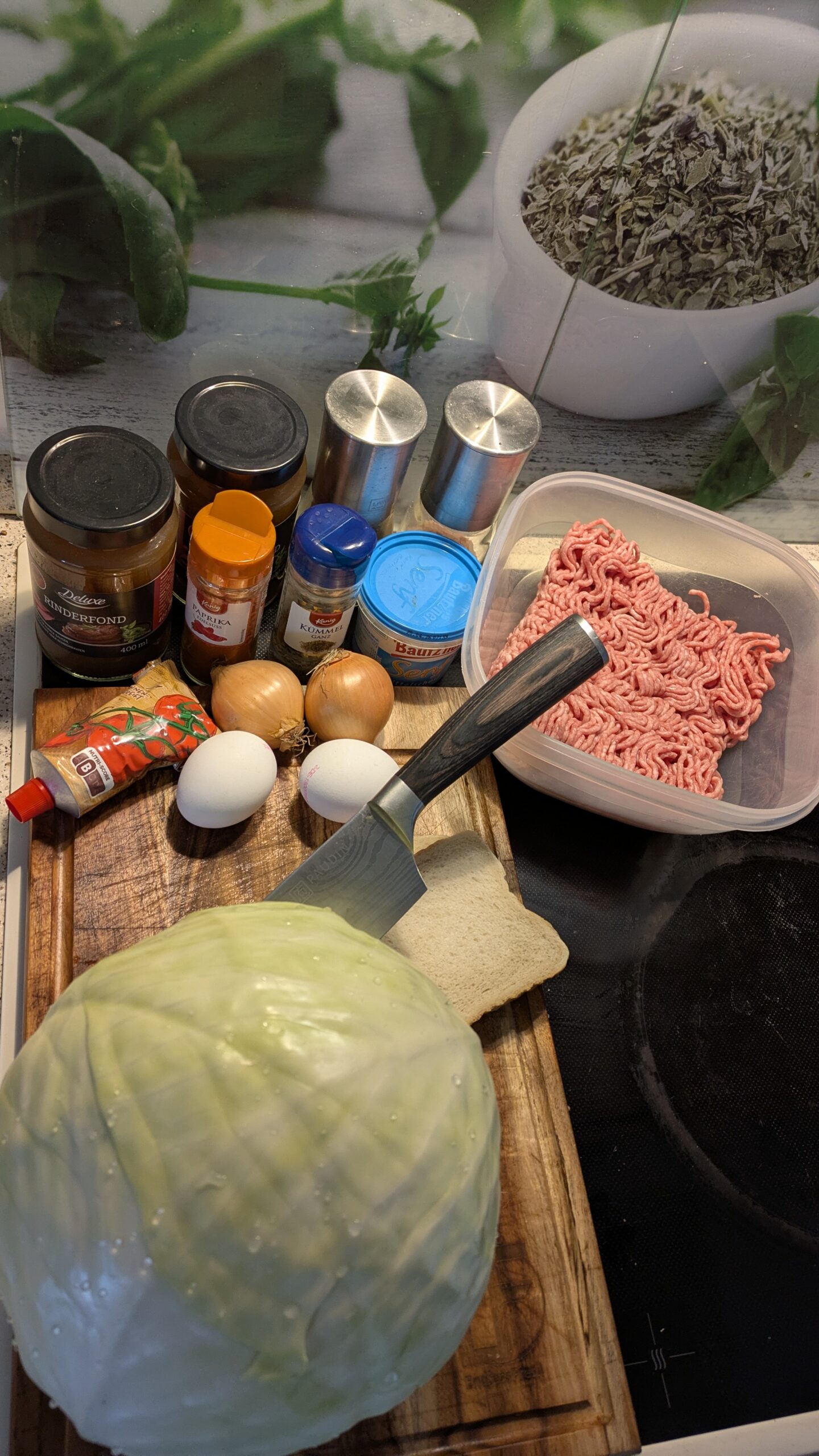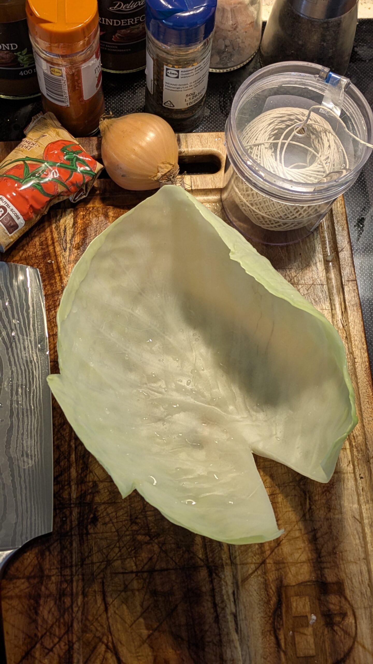 Je ein Kohlblatt auslegen, etwas Hackmasse darauf verteilen, die Seiten einschlagen und fest aufrollen. Nach Bedarf mit Küchengarn oder Zahnstochern fixieren.