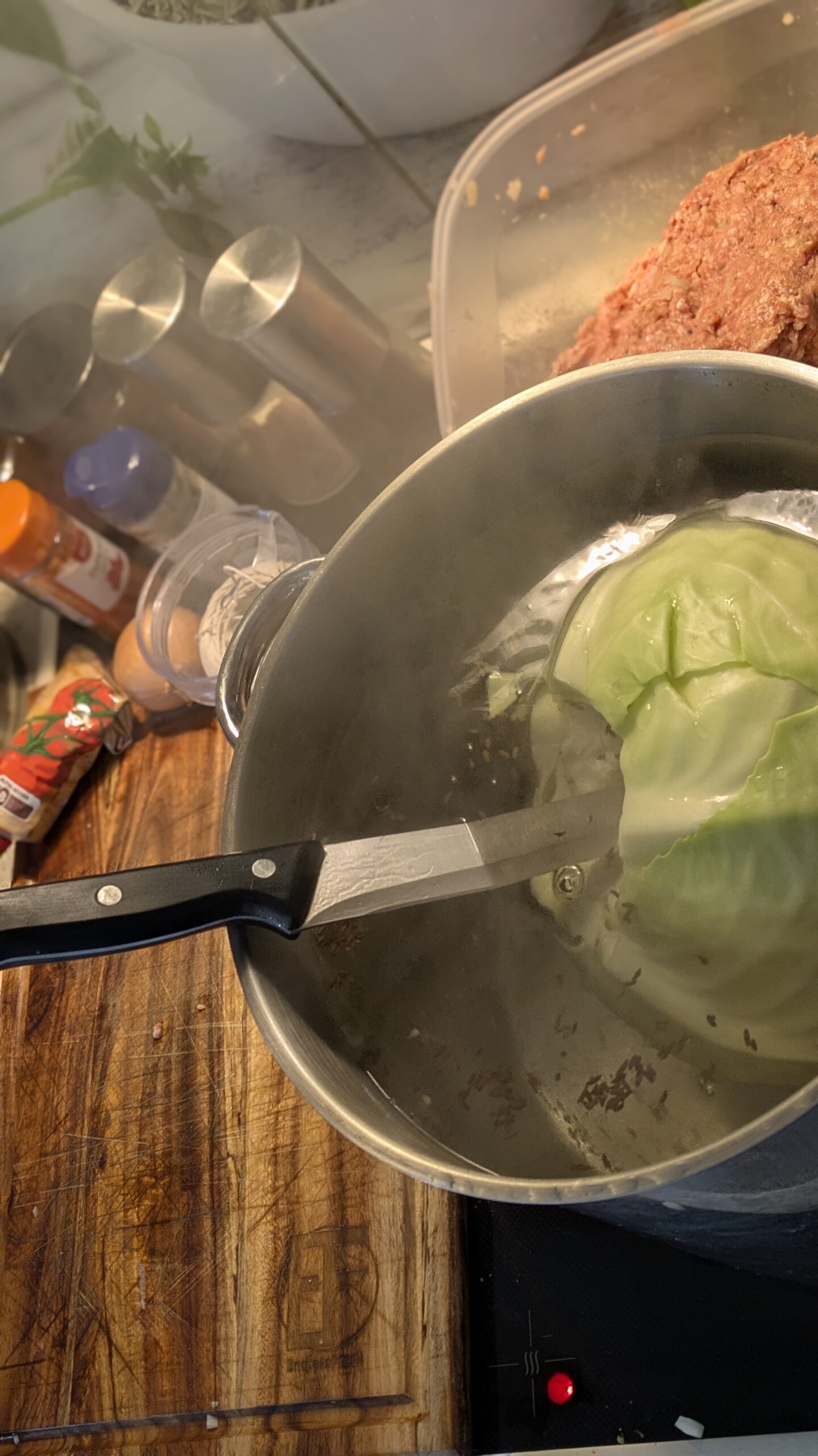Die äußeren Blätter vom Weißkohl vorsichtig ablösen. In mit Kümmel und reichlich kochendem Salzwasser 2–3 Minuten blanchieren, bis sie weich und biegsam sind. Herausnehmen, kalt abschrecken und gut abtropfen lassen. Dicke Blattrippen mit einem Messer flach schneiden. Den übrigen Kohl fein schneiden und beiseitestellen.