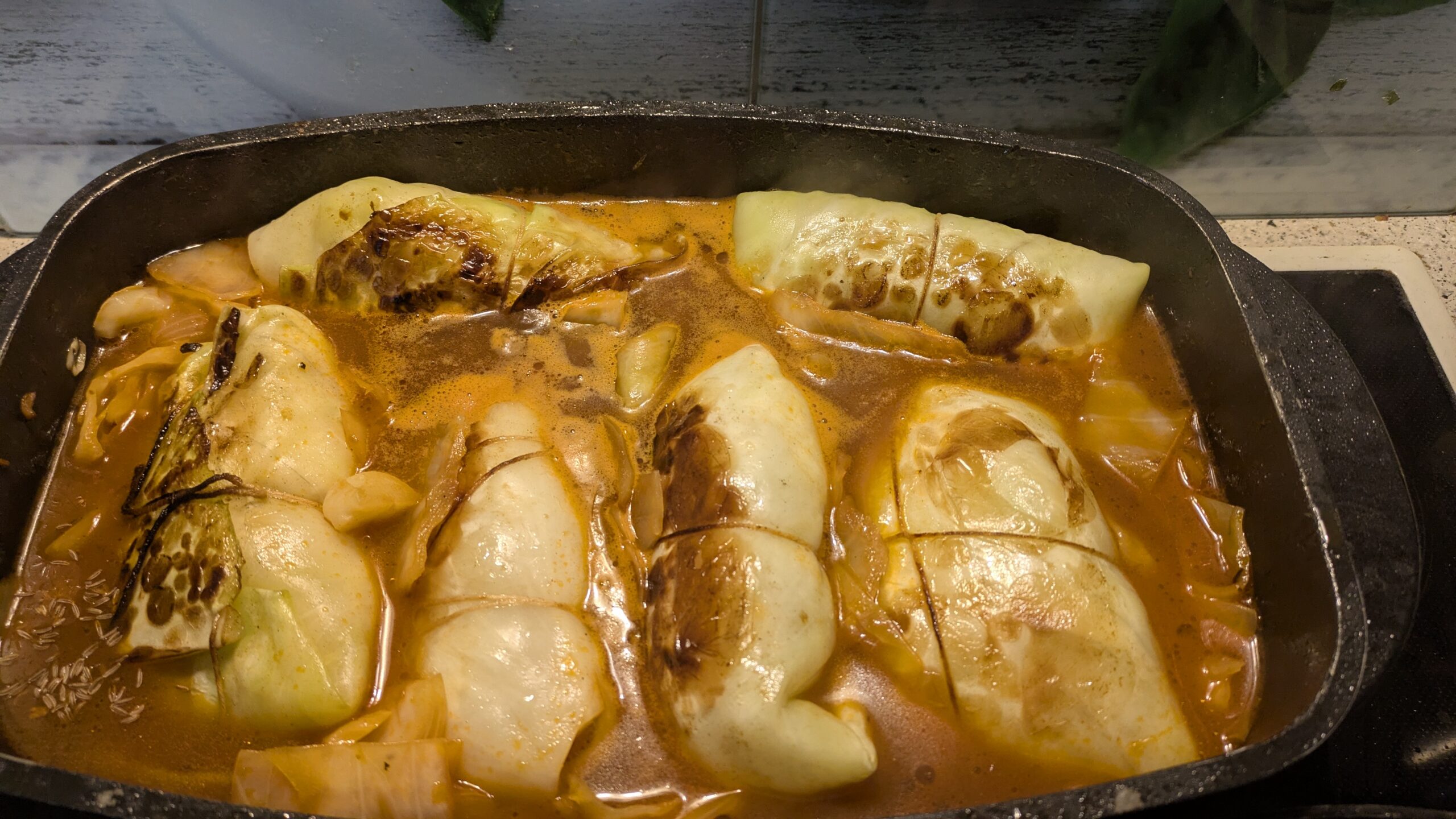 Die Kohlrouladen in einen großen Bräter oder eine tiefe Auflaufform legen. Die heiße Soße darüber gießen, sodass die Rouladen fast bedeckt sind.